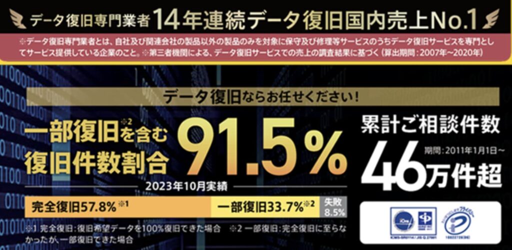 デジタルデータリカバリー』は、国内売上14年連続No.1のデータ復旧業者です。HDDやサーバー、パソコン、スマホ、USBなど、軽度データ障害から重度物理障害まであらゆる機器に対応しています。