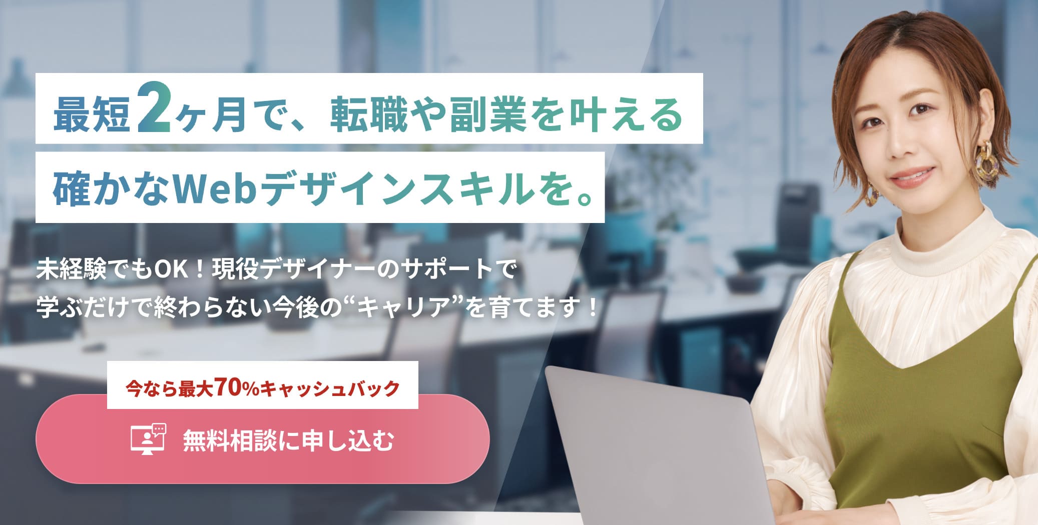 | 特徴 | ・オリジナルサイトを制作する実践的なカリキュラム ・リスキリング補助金で受講料70%キャッシュバック ・Photoshop・Illustrator・Figma・STUDIOを学べる | ・Web制作会社が運営する本格的なカリキュラム ・最大80%給付のReスキル通学講座数No.1 ・受講生の97%が給付金を活用して受講している |