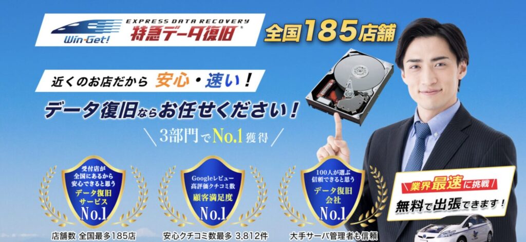 『特急データ復旧』は、全国に185店舗受付拠点がある業界大手のデータ復旧業者です。