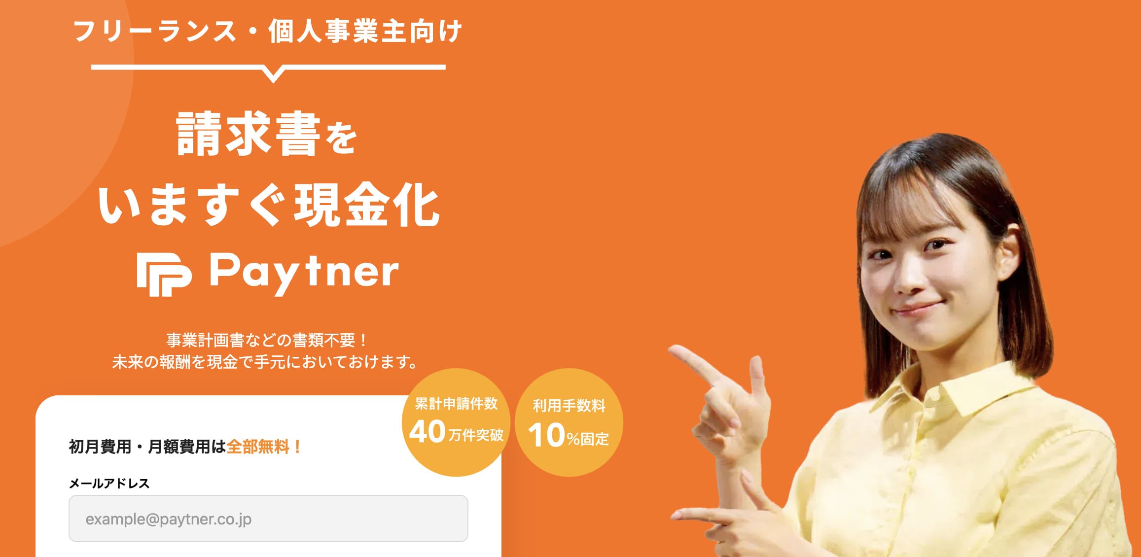 『ペイトナー』は、取引先に送付した請求書情報を登録することで、その報酬額をペイトナー社が立て替えて即日振り込んでくれるファクタリングサービスです。