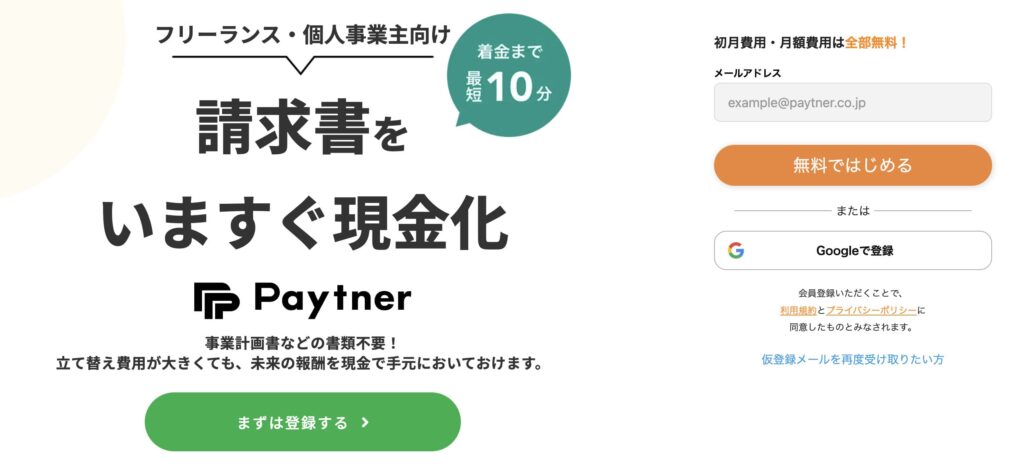 『ペイトナー』は、取引先に送付した請求書情報を登録することで、その報酬額をペイトナー社が立て替えて即日振り込んでくれるファクタリングサービスです。