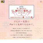 公益財団法人日本漢字能力検定協会では、「第13回 今、あなたに贈りたい漢字コンテスト」を開催中です。「贈りたい漢字一文字とメッセージ(120字以内)」をご応募ください。文部科学大臣賞(計4点)受賞の方には賞状と5万円相当の副賞、日本漢字能力検定協会賞(計4点)、審査員賞(計12点)には、それぞれ3万円、1万円相当の副賞をプレゼントします(その他、佳作(計40点)有)。