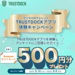 【アプリ体験&アンケート】デジタルIDウォレット「TRUSTDOCKアプリ」をダウンロードして認証アカウント登録を行い、本アプリのID連携機能を体験してアンケートにお答えいただいた100,000名様に、Amazonギフト券(コードタイプ)500円分をプレゼントいたします。 ※詳細はキャンペーンページをご覧ください。